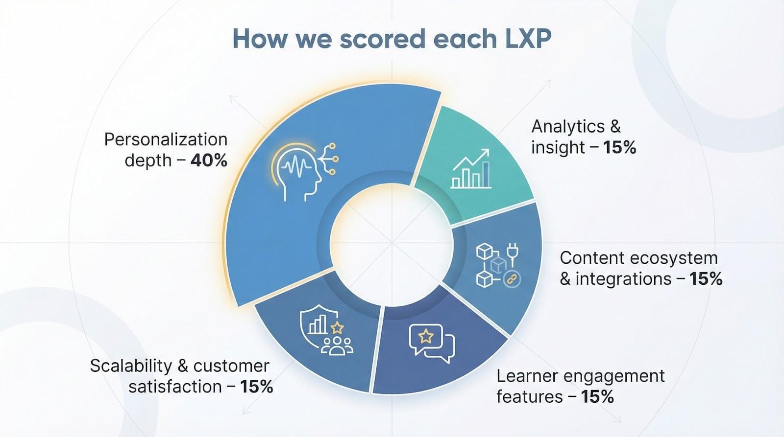 - Personalization depth (40 percent). Does the platform use AI, skill graphs, and real-time behavior to shape a unique path for every learner?